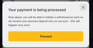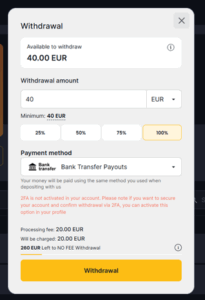 Hierbij komt dat uitbetaling niet vanzelfsprekend is. De kans is groot dat je in het uitbetalingsproces ineens wel een verificatie van je identiteit moet doorgaan. Wanneer de gegevens dan niet 1-op-1 overeenkomen met de eerder opgegeven gegevens, wordt de betaling geweigerd, en ben je je geld kwijt. Zoals ook te zien valt is de processing fee 20 euro. Zelfs wanneer een speler het gestorte bedrag van €40 direct laat uitbetalen is deze hiervan de helft kwijt aan kosten. Iets wat bij legale aanbieders niet kan, zij dragen immers de transactiekosten.