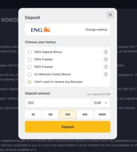 Het aanmaken van een account kostte minder dan 2 minuten. Doordat er geen sprake is van een daadwerkelijk verificatieproces is het enkel nodig om zeer basis informatie op te geven. Er is geen paspoort of andere ID controle. Daarbij is er ook geen leeftijdscontrole of controle via bijvoorbeeld iDIN. Je hoeft enkel een geboortedatum op te geven en een adres in Nederland, welke allebei niet hoeven te kloppen. Wat het hele proces extra kwalijk maakt, is dat KokoBet Nederlandse spelers gewoon accepteert. Er worden Nederlandse persoonsgegevens gevraagd, de Nederlandse nationaliteit kan aangegeven worden en verificatie is mogelijk met een Nederlands telefoonnummer.